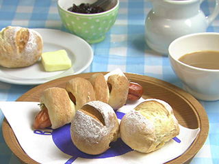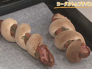 「ヨーグルトのプチパン」と同様の生地を6等分に切り分け、それぞれ30cm長さのひも状にのばす。10~12cm長さのソーセージにタイム1本を添え、生地1本をらせん状に巻きつける。これを6個作り、同様にして焼く。