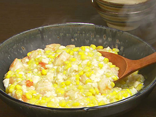 豆腐は切らずにそのまま加えて、木べらでくずします。