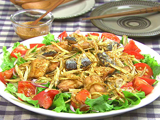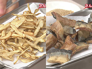 ごぼうは切ってすぐに揚げれば、水にさらさなくてもよい。ごぼう、さんまの順に揚げ、どちらもカラリとするまで香ばしく揚げる。