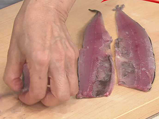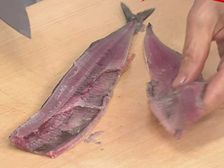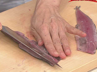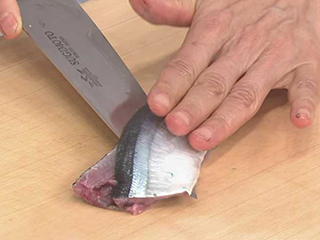 (7) おろし身2枚は、腹骨の際に包丁の刃を当て、骨を少し起こすようにして腹骨をすきとる。
