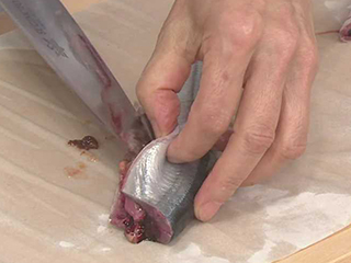 (3) 腹ワタを除いたら、中骨の血合いの部分もよく洗い落とし、水気をしっかりふく。