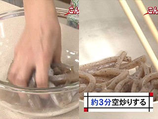 こんにゃくの空炒りはじっくり時間をかけることが大切、こんにゃくが白っぽくなり、炒める音が低くなるまで(約3分)、水分をとばしておくと味も入りやすく、歯ごたえもよくなります。