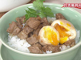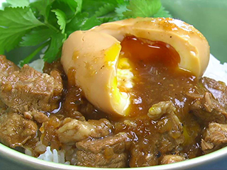 器にごはんを盛り、台湾風肉みそをのせる。半分に切ったゆで卵と香菜を添える。