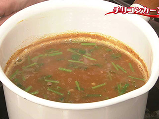 小鍋に水1カップ、「チリコンカーン」200gを入れて中火にかけ、ひと煮立ちさせる。塩小さじ1/4で味をととのえ、1cm長さに切った香菜適量を加え、火を止める。