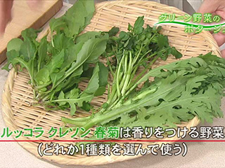 ポタージュに香りをつける野菜。ルッコラのほかに、春菊、クレソンなどもおすすめ。