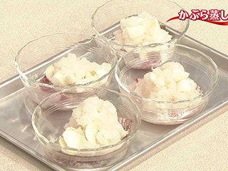 盛りつける器が蒸し器に4つ入らないときは、耐熱容器を使うとよい。蒸し上がったら、器に盛りなおし、銀あんをかける。