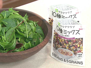 10種ミックス(豆と穀物)〈サラダクラブ〉 5種の豆(ひよこまめ、えんどう、レンズまめ、小豆、大豆)と5種の穀物(玄米、押麦、赤米、黒米、もち麦)をミックスしたもの。袋から出してそのまま使えるので便利。