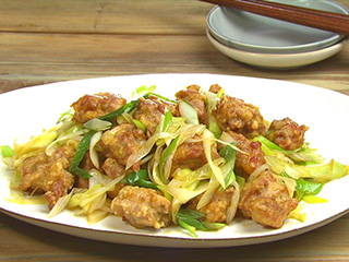 先に加熱した長ねぎとたれを合わせて味をつけてから豚肉を加えること。