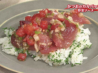 温かいごはん400gに塩、こしょう各少々、パセリのみじん切り大さじ2、オリーブ油適量を混ぜる。 適量とりわけ、カルパッチョとソースをのせていただきます。