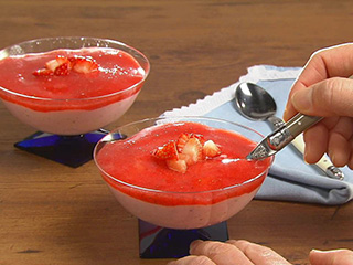 大きい容器に全量を入れ、冷やし時間を長めにして冷やし固める。スプーンでとり分けて器に盛り、いちごのピューレを添える。