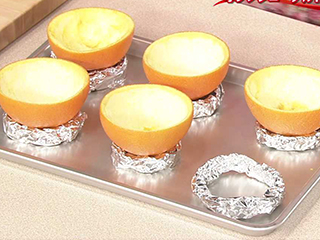 オレンジの皮をカップに使うので、果汁を搾るときはオレンジの皮が破れないようにていねいに。