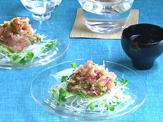 (8) 頭側の背の部分の皮を指先でこそげてとっかかりをつけ、尾側に向けて皮を引く。身を斜めに細く引き切りにする。
