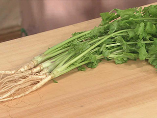 中国語で香菜、タイ語でパクチー、英語でコリアンダーなどいろいろな呼び名があり、アジア、南米、中近東などで幅広い料理に使われるハーブ。葉、茎に加えて根も香りがよいので、根つきを買い求めて刻んで使うとよい。