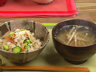 炊きたての熱いうちに干ものと梅肉、調味料を混ぜ、すぐに食べない場合は香味野菜を人肌に冷ましてから加えるとよい(色が悪くならないように)。