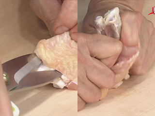 骨に沿ってハサミを入れて、骨を出し、肉の形を整えて、食べやすくする。