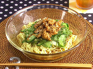 塩もみきゅうりにめかぶを混ぜておくと麺とよくからみ易くなります。