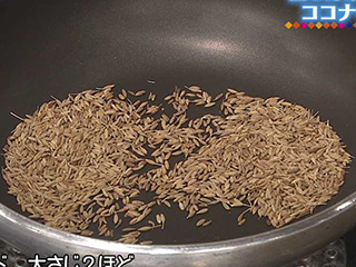 クミンシード適量をフライパンに入れて中火にかけ、絶えず混ぜながら香ばしく空炒りし、煙が出はじめたら火を止め、余熱でカリッとするまで火を通す。