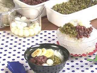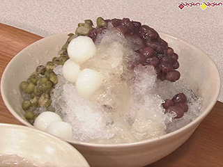 かき氷に具をのせて濃いシロップをかけるとひんやりに。