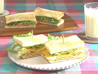 はさんだものは、豚肉焼き、両面焼いた目玉焼き、レタス、チェダーチーズの4種類。パンにぬるのは、味の決め手の甘いマヨソースとバター。