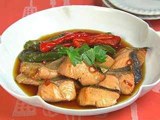 鮭もつけ合わせのピーマンもこんがりと焼いて、熱いうちに南蛮酢に漬け込むこと。