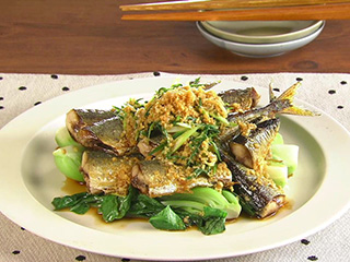 レンジ加熱したチンゲンサイはザルに上げて水気をきってから盛ること(味が薄まらないように)。