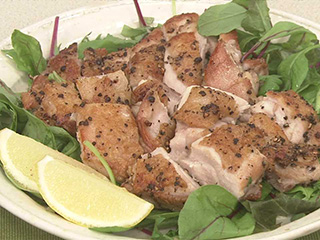 鶏肉の黒こしょう焼きの黒こしょうは粒のこしょうをつぶして使います。(ペッパーミルやすり鉢で砕いて)