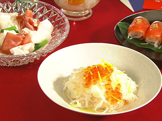 大根だけのなますを作って食べるときにサーモン、いくら、あんずをプラスして紅白なますが完成です。