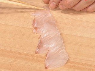 切った刺身は巾の広い方が上になるように縦長に重ねて巻きます。