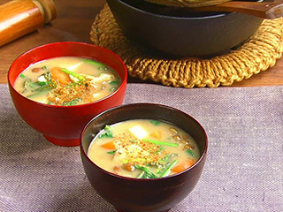 納豆を煮汁に直接加えると混ざりにくいので、すりつぶした納豆に煮汁を適量加えてときのばしてから鍋に入れること。