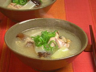 韓国の参鶏湯(サンゲタン)のような骨付き肉や干し椎茸からうま味が出たとろとろのスープ。