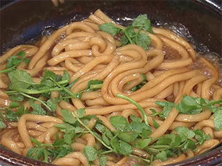 残した煮汁に、ゆでうどん2玉(360g)を加え、3分ほど煮る。あればせりを刻んで散らす。