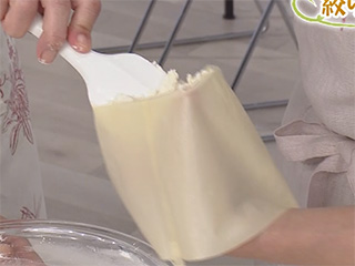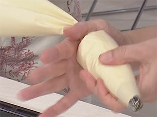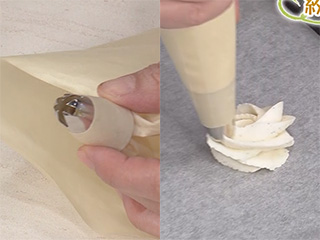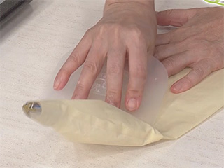 (3) 親指と人さし指でしっかり押さえながら絞り袋を持って、絞り出す。