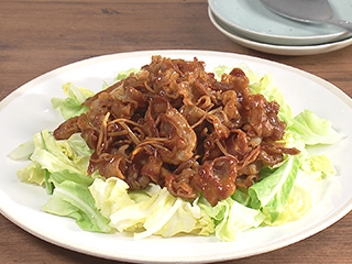 レンジ加熱したキャベツは水気をきって器に盛ります。