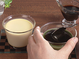 プリン液は必ずザルでこしてから容器に流し、表面の泡を取り除いておくことも大切(ペーパータオルを当てて取り除く)。