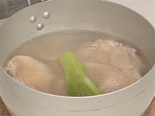 鶏肉をゆでた汁でスープを作ります。
