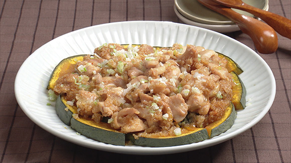 かぼちゃが重ならないように広げられる耐熱皿を用意し、鶏肉も火の通りが均一になるように広げます。