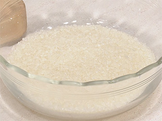もち米を水につけて蒸し、乾燥させてひいたもので、ひき方によって粒の大きさがいろいろある。今回は、桜もちに使われる大きさの粒のものを使用している。