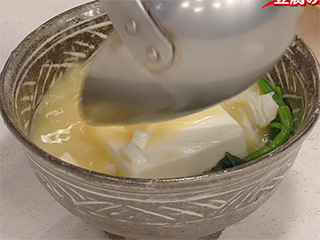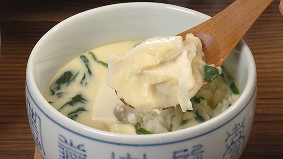 耐熱の器に豆腐を入れ、まわりにゆでたほうれん草、帆立を入れて、豆腐の上から卵液を注ぐ。
