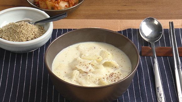 えごまはシソ科の植物で、韓国では葉を、日本では主に種子を使う。東北地方で「じゅうねん」、信州地方で「いくさ」などとも呼ばれる。えごまの粉はえごまの種子を焙煎してすったもので、サラダやあえものなどにも使う。