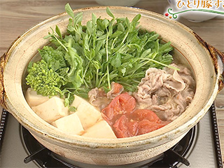 火の通りやすいしゃぶしゃぶ用の豚肉、豆苗、豆腐のほかに、うまみのあるトマトをすべて鍋に入れてから、水としょうゆ、みりん、酒を加えて、火にかける。