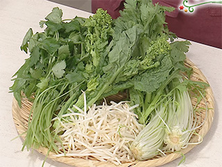 春菊、水菜、三つ葉、もやし、貝割れ菜などお好みで季節の野菜を使ってください。