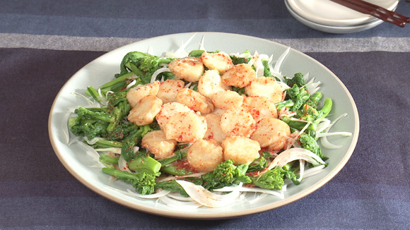 帆立は揚げ始めは表面が固まるまで菜箸などでさわらないこと!表面がカリっとしたらすぐとり出す(刺身用以外の帆立で作るときは中まで火を通すこと)。