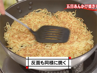 中華蒸しめんは、フライ返しで押さえながら焼いて、焼き色をつける。