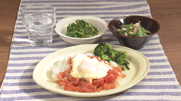 トマトがとろっとくずれるまで焼いたら、卵を真ん中に入れる。