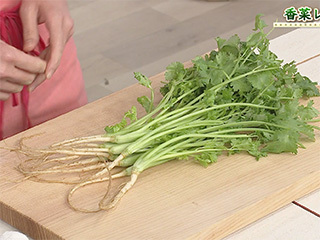 パクチーやコリアンダーとも呼ばれ、独特の香りがある香草。スープやめん料理、炒めものなどに幅広く使われる。根にも香りがあるので、捨てずに使うとよい。