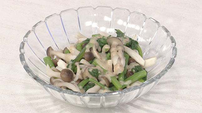 つるむらさきは茎と葉先に分け、時間差でゆでます。