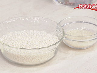 もち米(左)1+3/4合に、米(うるち米)1/4合を混ぜて炊く。
