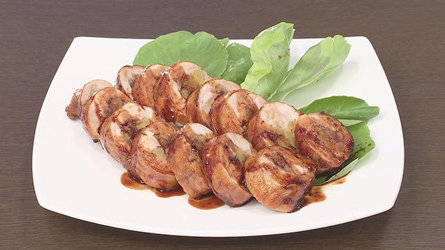 鶏肉の身の厚いところは小さくそぎとって、薄いところにはりつけて厚みを均一にしてから栗をのせること。