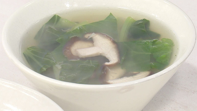 スープの小松菜は、茎と葉先に分け、時間差で加えるとバランスよく火が通ります