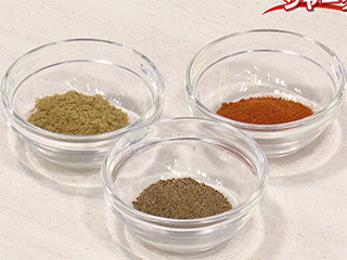 3種のスパイスを使用。左から時計回りに、クミンパウダー、チリパウダー、オールスパイス。オールスパイスはシナモン、クローブ、ナツメッグの3つの香りを持つことが名の由来。中南米原産で別名ジャマイカペッパーとも。